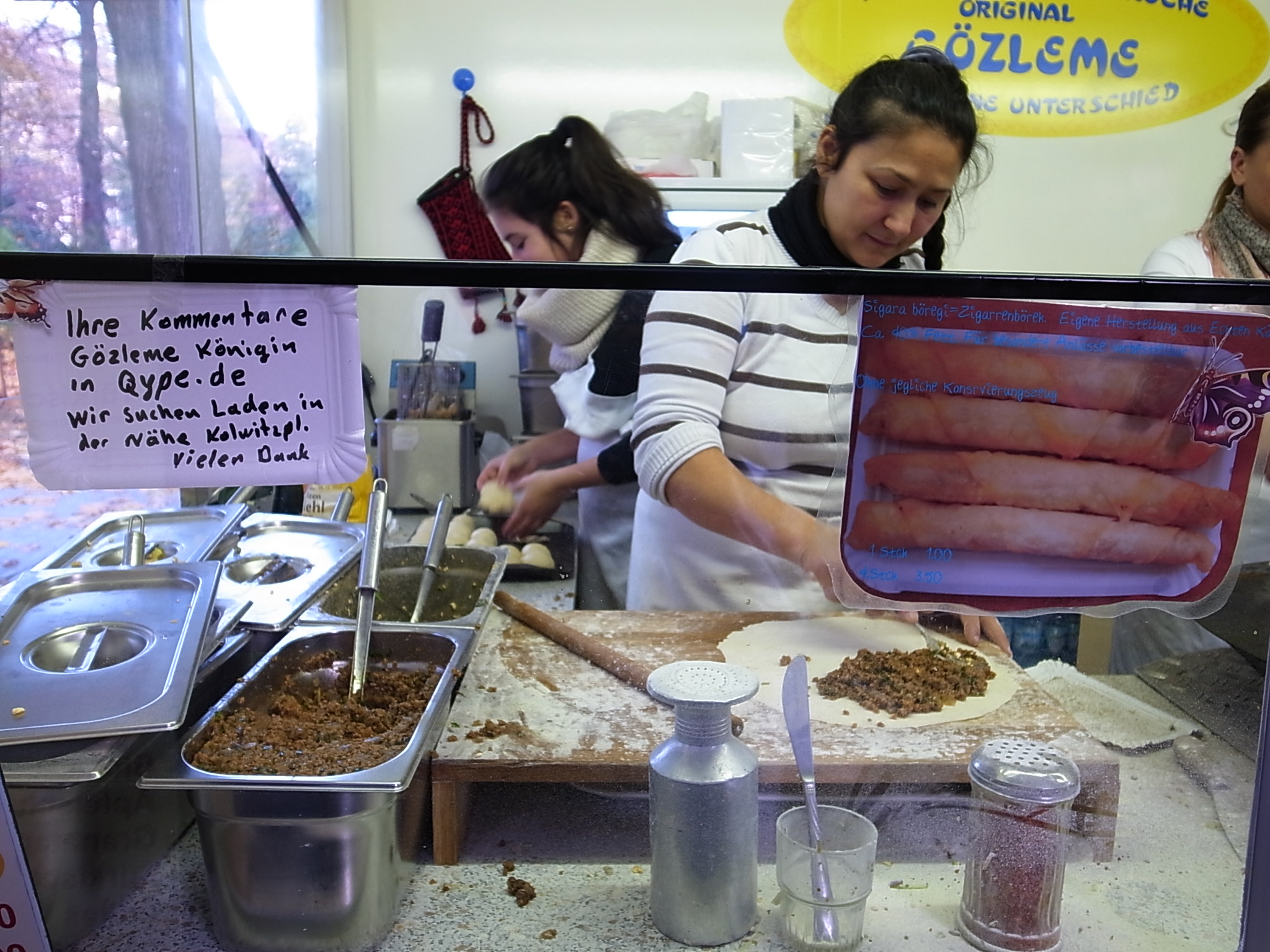 逛農夫市集可是會上癮的。先別說那五顏六色的當季新鮮有機水果、蔬菜,肉舖、起司鋪、海鮮、火腿……標上有機標誌,寫上產地、名稱與價格,看著看著簡直像是讀一本活生生的食材課本,很是興奮;接著讓人食慾大開的,就是一輛輛行動餐車上賣的熟食!若不上小館子,市集裡一攤攤的異國美食總是能滿足我對異國滋味的渴望︰大份量的土耳其Doner Kebab沙威瑪、中東的Falafels、義大利手工Pizza與德國咖哩香腸,還有不時可見到的亞洲炒麵,點一份主食再加上一杯啤酒,站在Standing Bar邊吃完,肚子飽了食慾也滿足了。冬季或聖誕節的前兩個月,加上肉桂與香料的熱紅酒是逛市集的必備飲品,而夏天來臨之時,廣場裡的大人小孩則是人手一球冰淇淋。